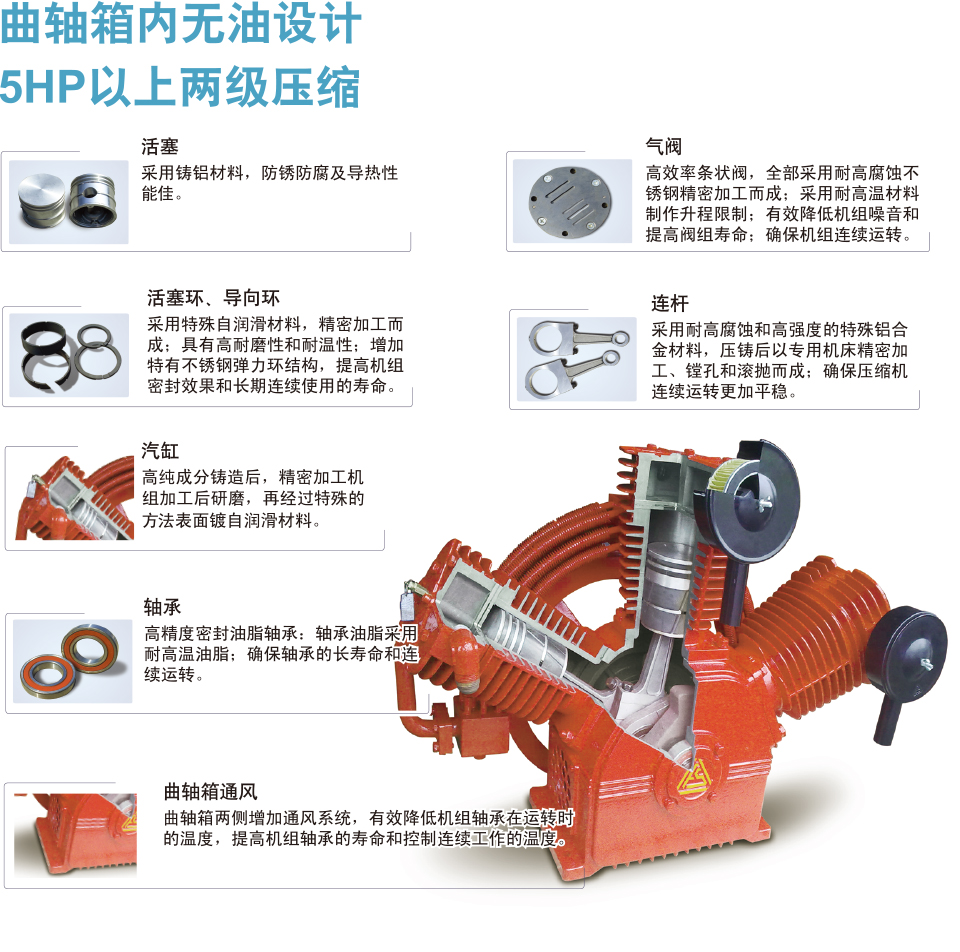 TW型机体与空气桶整体平衡设计降低了运转噪音与震动,同时透过低速转动增加活动件的寿命。为了提高密封性及可靠性,而采用了高强度脂润滑轴承。另外还加入了曲轴箱散热孔,藉由两者延长轴承寿命。5.5kW(含)以上机型双段压缩设计使排气温度降低,效率提升。其吸排气阀采专用耐高温如片阀设计,提高气密性,而且使用的不锈钢材质更提高质量可靠性。活塞所使用之压缩环为弹簧式压缩环,压缩时气密性提高,减少空气泄漏, 使容积效率大幅提升。